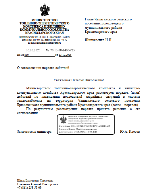 1. Утвердить схему теплоснабжения Чепигинского сельского поселения Брюховецкого района на период 2032г. (актуализация 2026 г.).