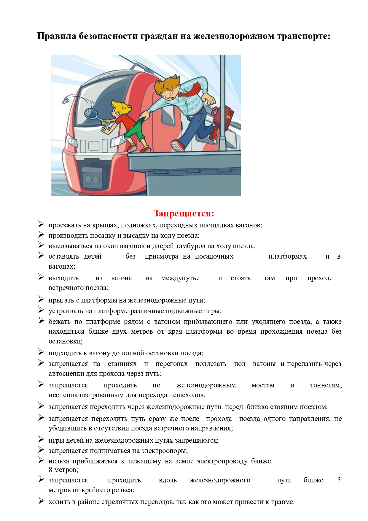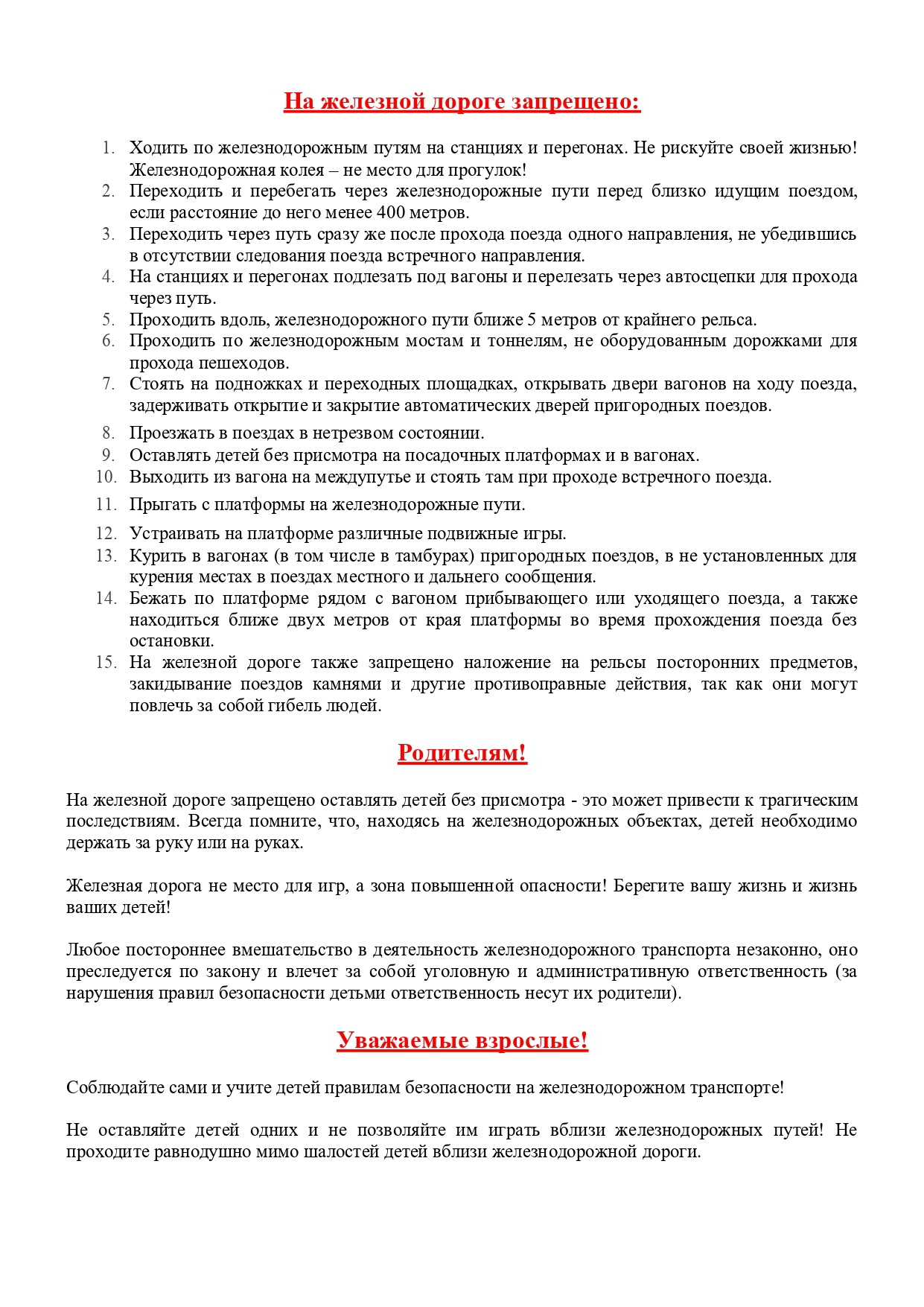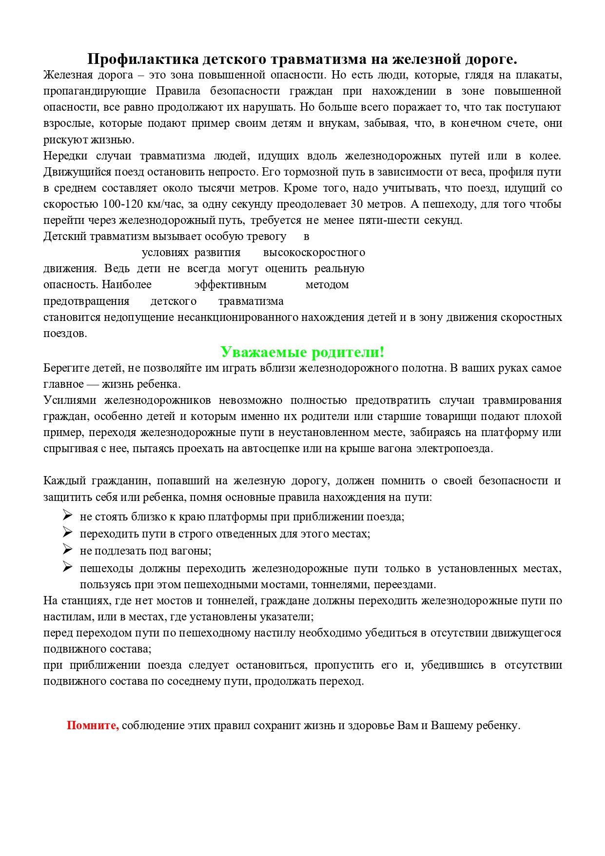 ОАО "Российские железные дороги " в рамках проведения в период с 1 сентября до 30 сентября 2025 года месячника "Уступи дорогу поездам" напоминает о соблюдении требований разделов 3 и 4 Правил нахождения граждан и размещения объектов в зонах повышенной опасности, выполнения в этих зонах работ, проезда и перехода через железнодорожные пути, утвержденных приказом Министерства транспорта РФ от 27 января 2022 года N 20