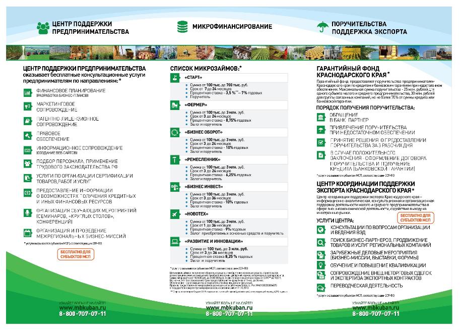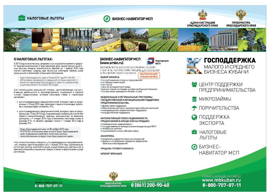 В рамках поддержки субъектов малого и среднего предпринимательства на территории муниципального образования Брюховецкий район действуют следующие меры государственной поддержки.