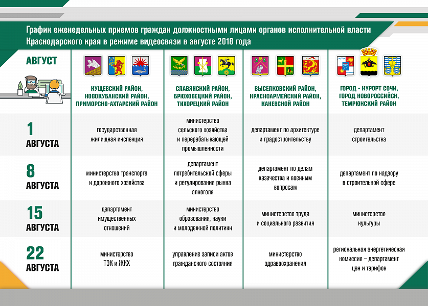 На сегодняшний день составлен график приемов на август. Согласно ему, раз в неделю с гражданами, приглашенными в администрации муниципальных образований, будут общаться представители четырех ведомств из Краснодара.