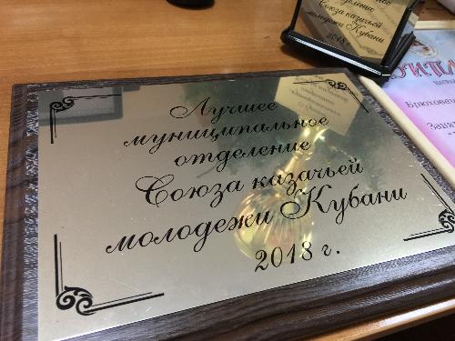 Брюховецкое отделение Союза казачьей молодежи Кубани признано победителем в краевом конкурсе среди муниципальных образований на лучшую организацию работы с казачьей молодежью. Руководитель отделения Денис Смелов награжден Почетной грамотой атамана Кубанского казачьего войска.