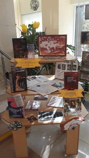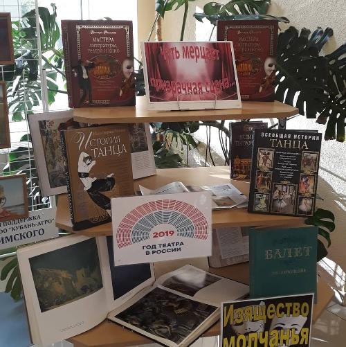Книжно-предметные выставки в фойе служили иллюстрацией театрального действа. Выставка-просмотр «Закулисье: Кубань. Театр. История» была дополнена экспонатами Брюховецкого историко-краеведческого музея: экспозицией фотографий о народном театре станицы Брюховецкой, его спектаклях и актёрах, а также театральным реквизитом фотозоны «Балаганчик». Выставка-просмотр «Задумчив и божественно велик» была посвящена 220-летию со дня рождения А.С. Пушкина и его произведениям, ставшими классикой русского театра, на ней была представлена раритетная литература из фондов библиотеки - 10-томное собрание сочинений поэта 1957-1958 года издания. Выставка-показ «Спасти Ленинград», была подготовлена совместно с кинотеатром «Октябрь» и проводилась в рамках Года Даниила Гранина. Фотодокументы поведали о том, как театр помогал побеждать в блокадном Ленинграде. Программки и афиши, демонстрирующие современную театральную жизнь Санкт-Петербурга, стали ярким дополнением выставки.