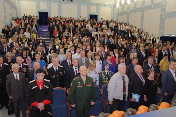 В зале собрались представители власти, молодежных и ветеранских организаций, труженики тыла, казачества, главы поселений, военнослужащие, а также руководители, педагоги и учащиеся общеобразовательных школ.