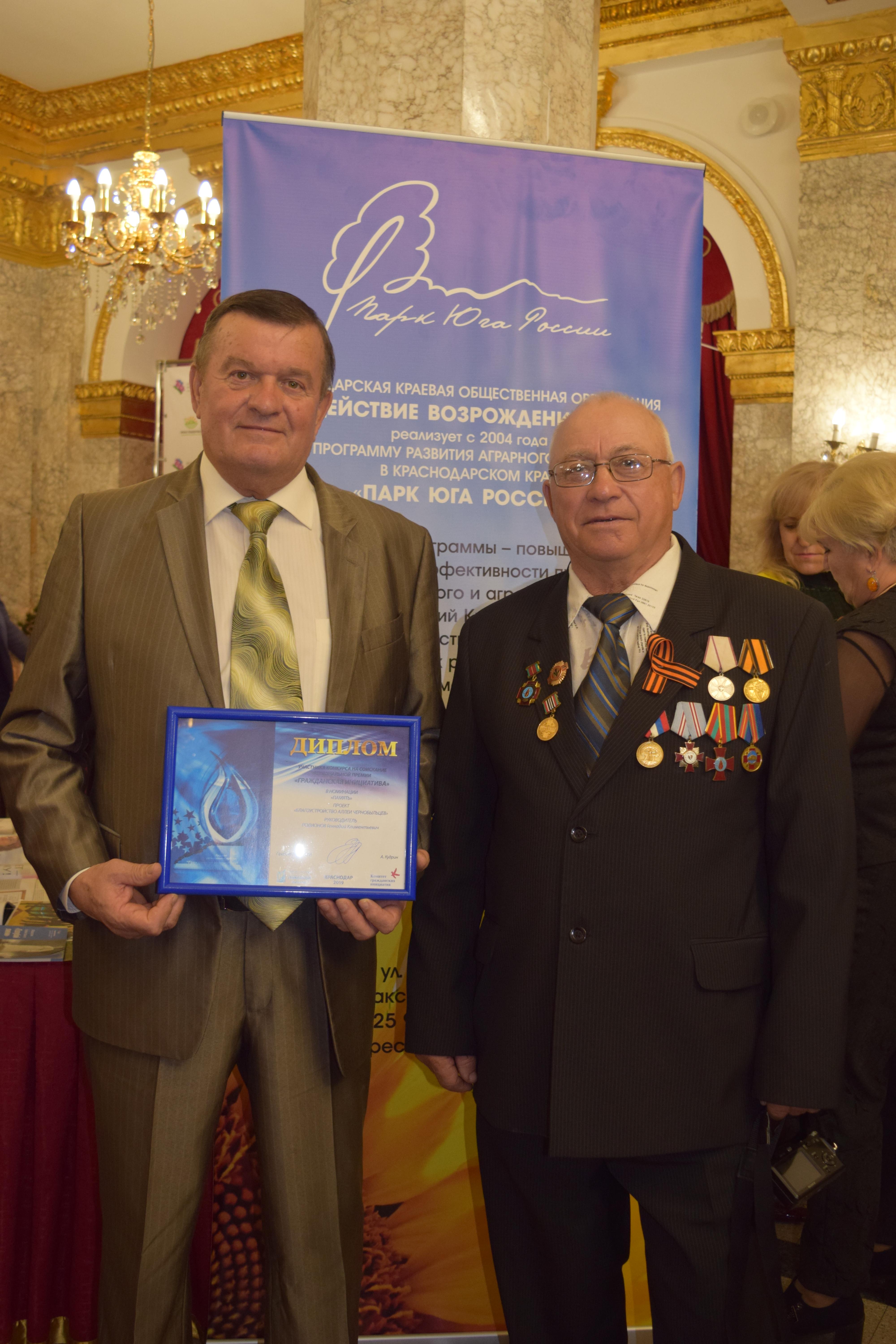 - номинация «Память», инициатива «Благоустройство Аллеи Чернобыльцев», организатор проекта - Брюховецкая районная некоммерческая общественная организация поддержки ликвидаторов аварии на Чернобыльской атомной электростанции «Чернобыль».