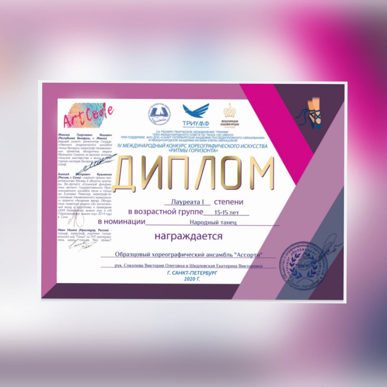 Солистка ансамбля Логина Ульяна в номинации "Народный танец" награждена дипломом Лауреата 1 степени. Учащиеся 1 класса в номинации "первые шаги" стали Лауреатами 2 степени, получив положительные отзывы от членов жюри.