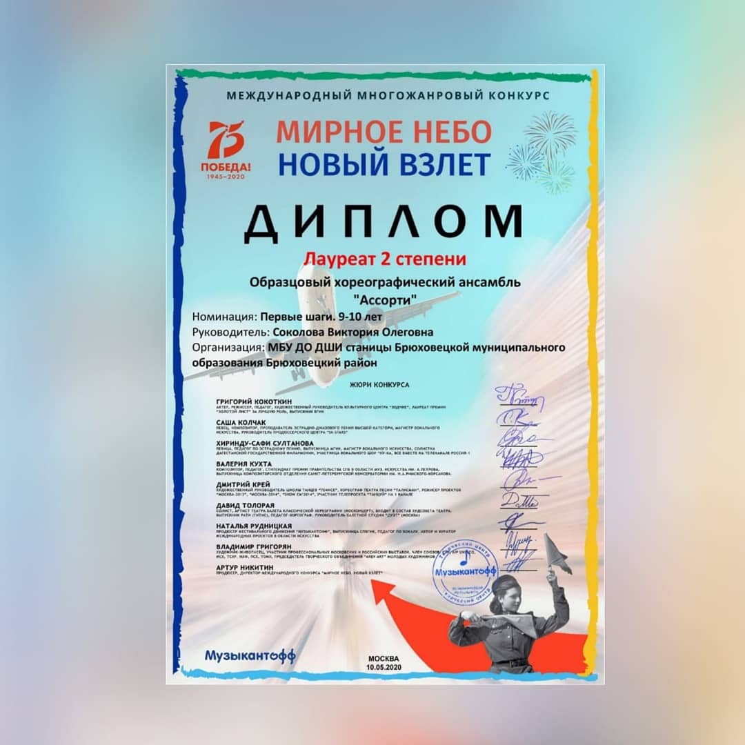 Образцовый хореографический ансамбль "Ассорти" достойно представил школу искусств станицы Брюховецкой на Международном многожанровом конкурсе "Мирное небо Новый взлет!"