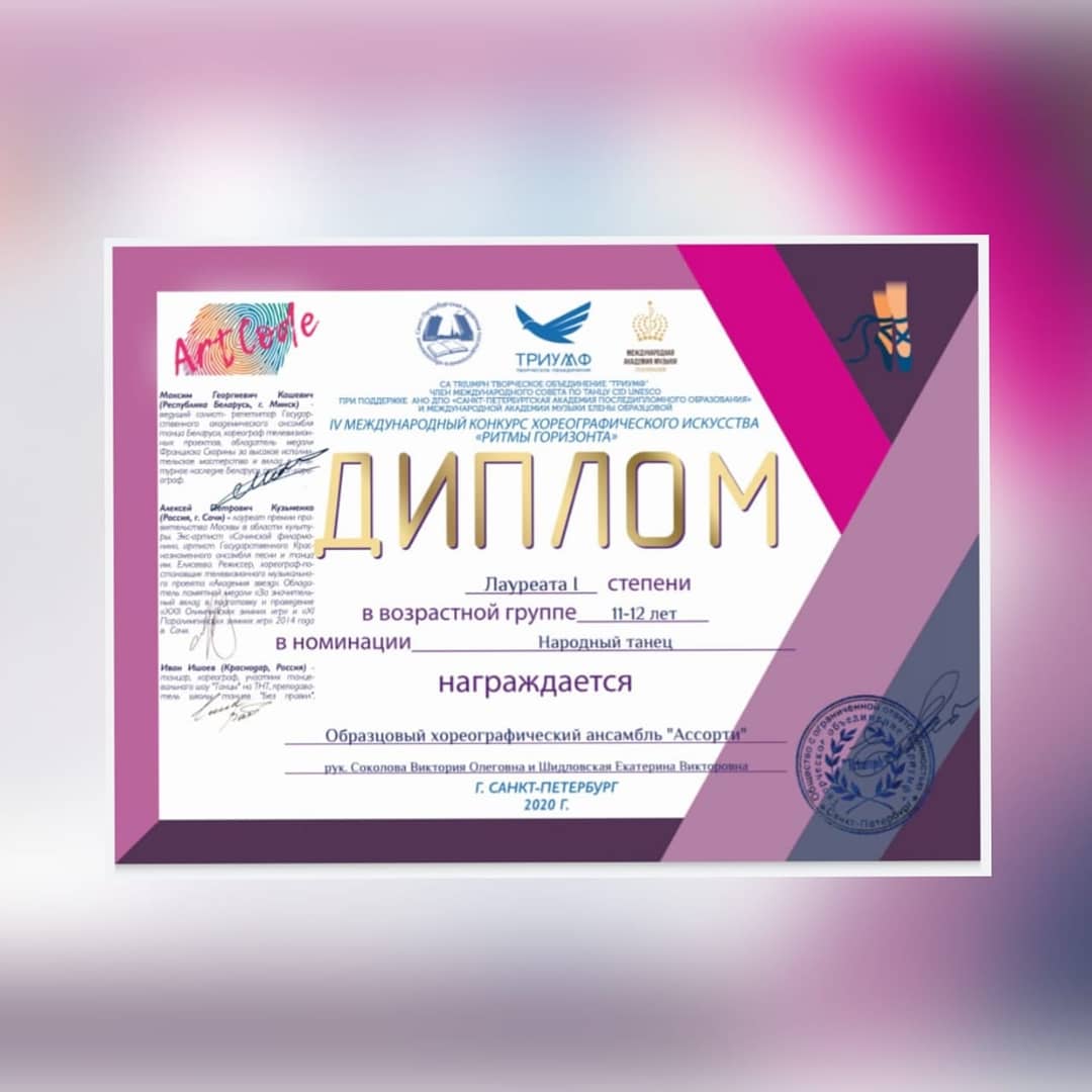На высоком уровне оценили выступление учащихся 5-6 классов в Международном конкурсе хореографического искусства "Ритмы горизонта", коллектив награждён дипломами Лауреата 1 степени.