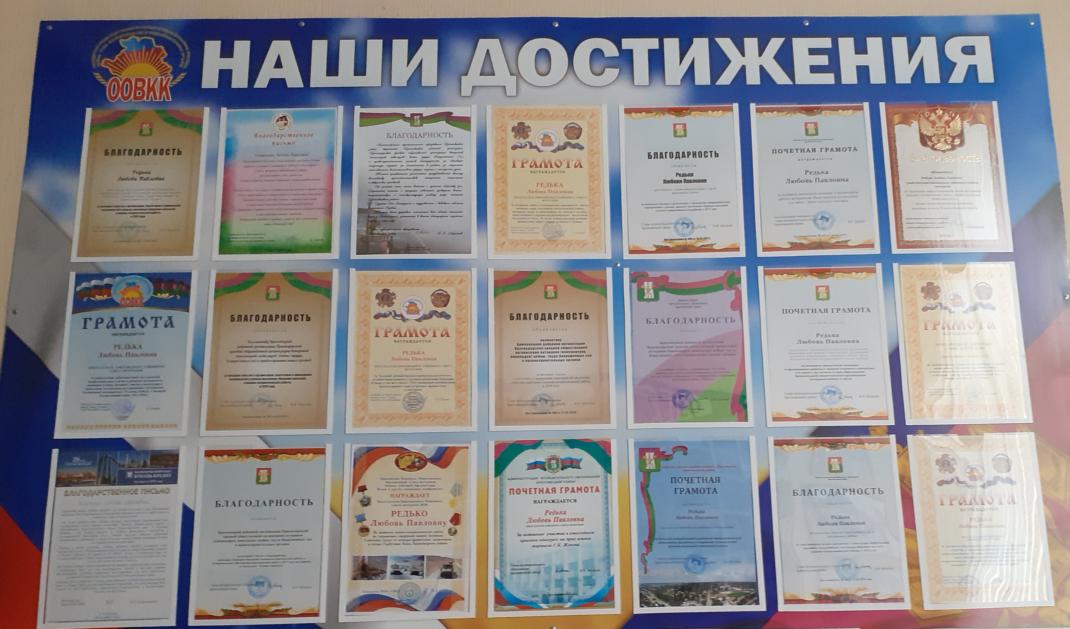 Первый стенд называется «Наши достижения». Здесь расположены Почетные грамоты краевой и районной администраций, краевого Совета ветеранов, Благодарности за активное участие в различных программах и акциях.