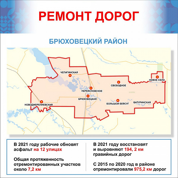 Кроме того, в Батуринском, Большебейсугском, Брюховецком, Новоджерелиевском, Новосельском, Переясловском, Свободненском и Чепигинском сельских поселениях обновят асфальт на 12 улицах. Общая протяженность отремонтированных участков составит около 7,2 км. Также рабочие восстановят, выровняют или уплотнят 194,2 км гравийных дорог.