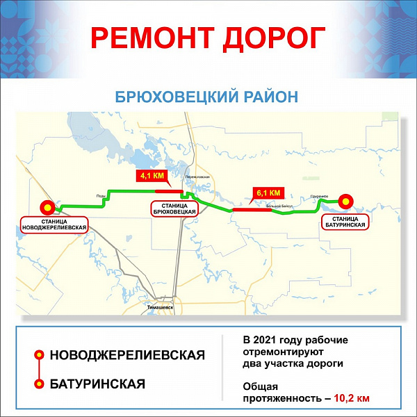 Например, в 2021 году в Брюховецком районе отремонтируют два участка региональной автотрассы между станицами Новоджерелиевская и Батуринская общей протяженностью 10,2 км.