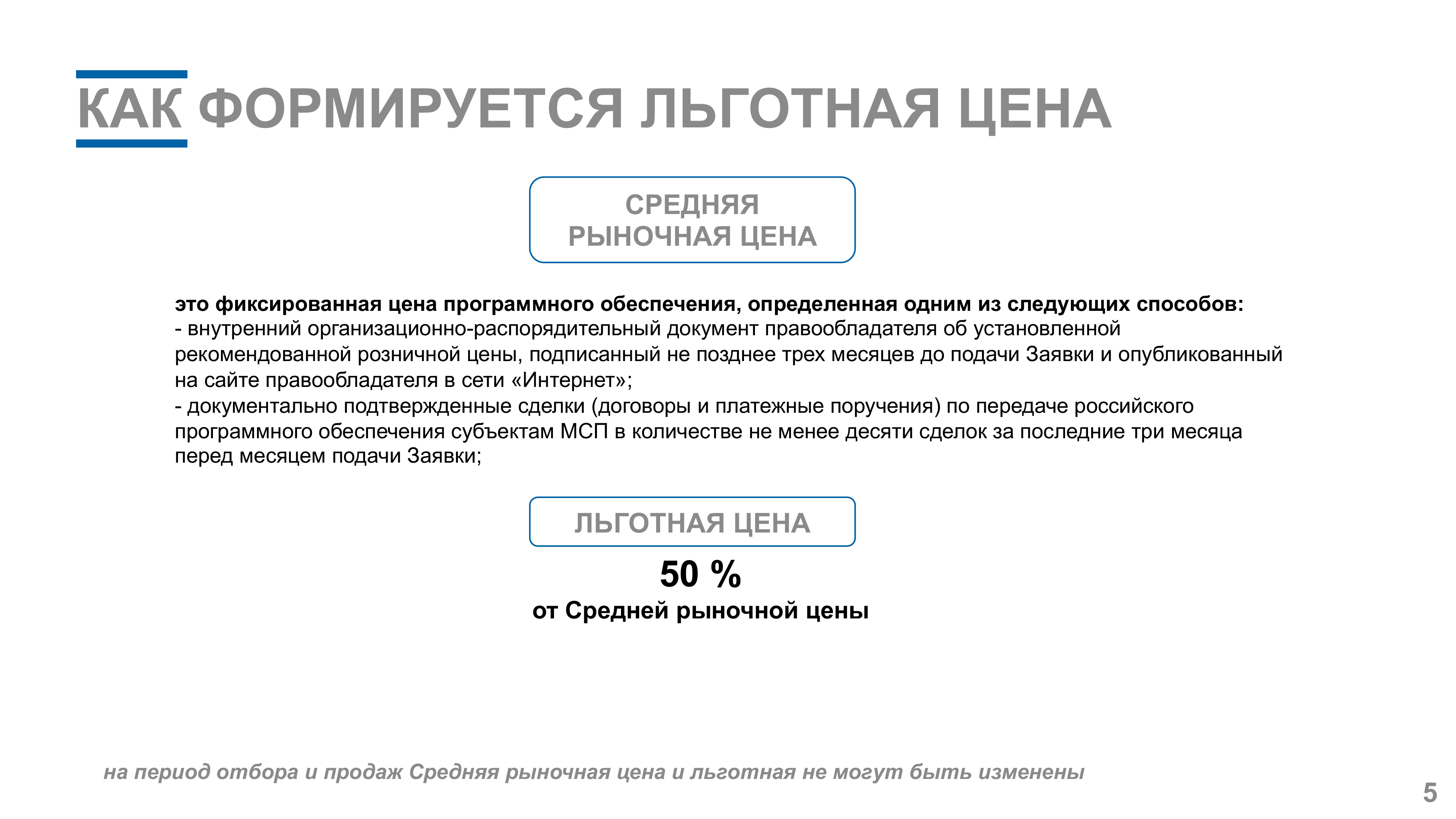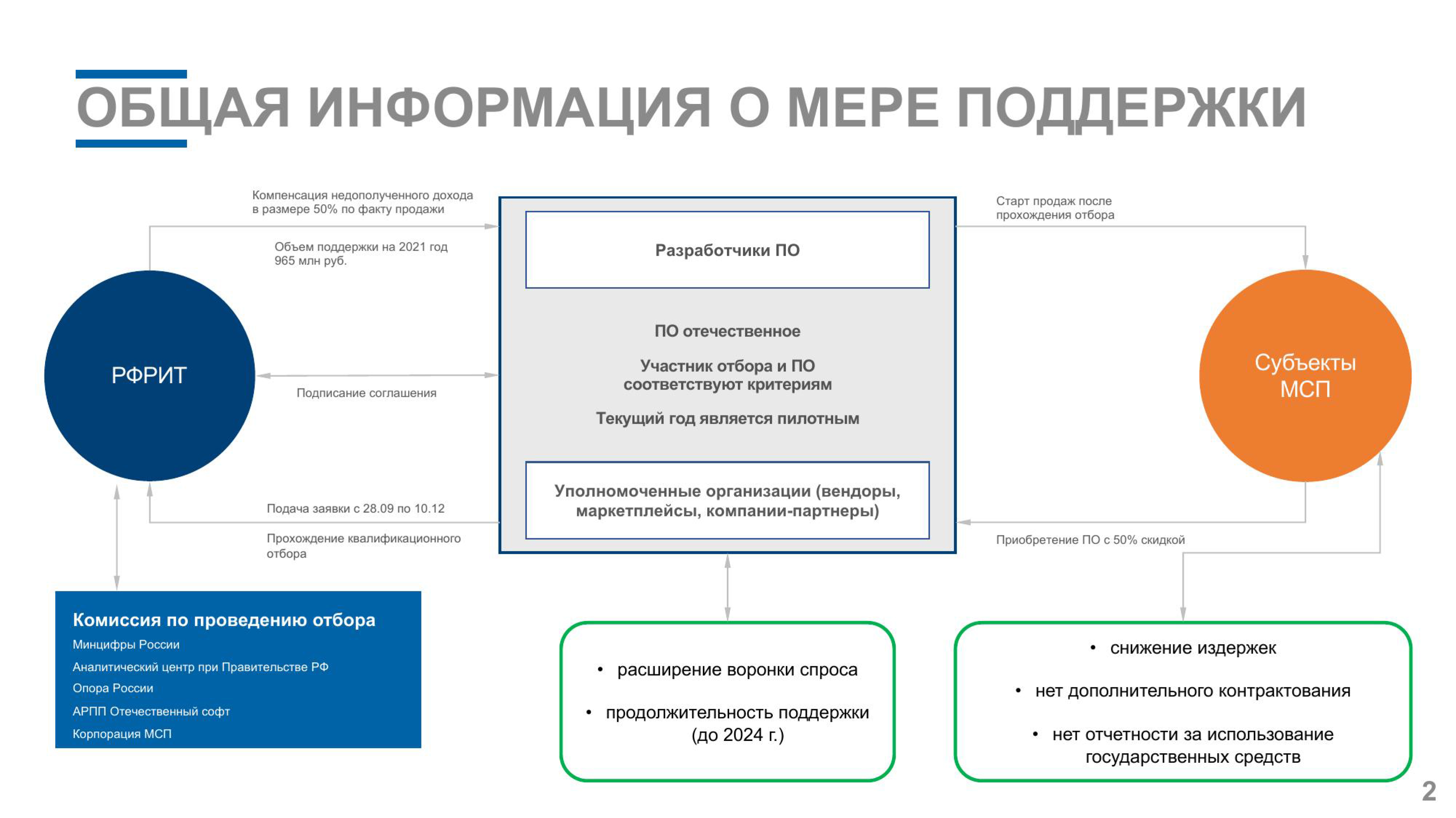 В 2021 году общий объем средств федерального бюджета, предусмотренных на реализацию указанной меры поддержки, составляет 965 млн. руб. и будет направлен на возмещение недополученных доходов правообладателей (уполномоченных организаций) от продажи субъектам малого и среднего предпринимательства российского облачного программного обеспечения со скидкой 50%. Совокупный объем поддержки до 2024 года составляет порядка 7 млрд. руб.