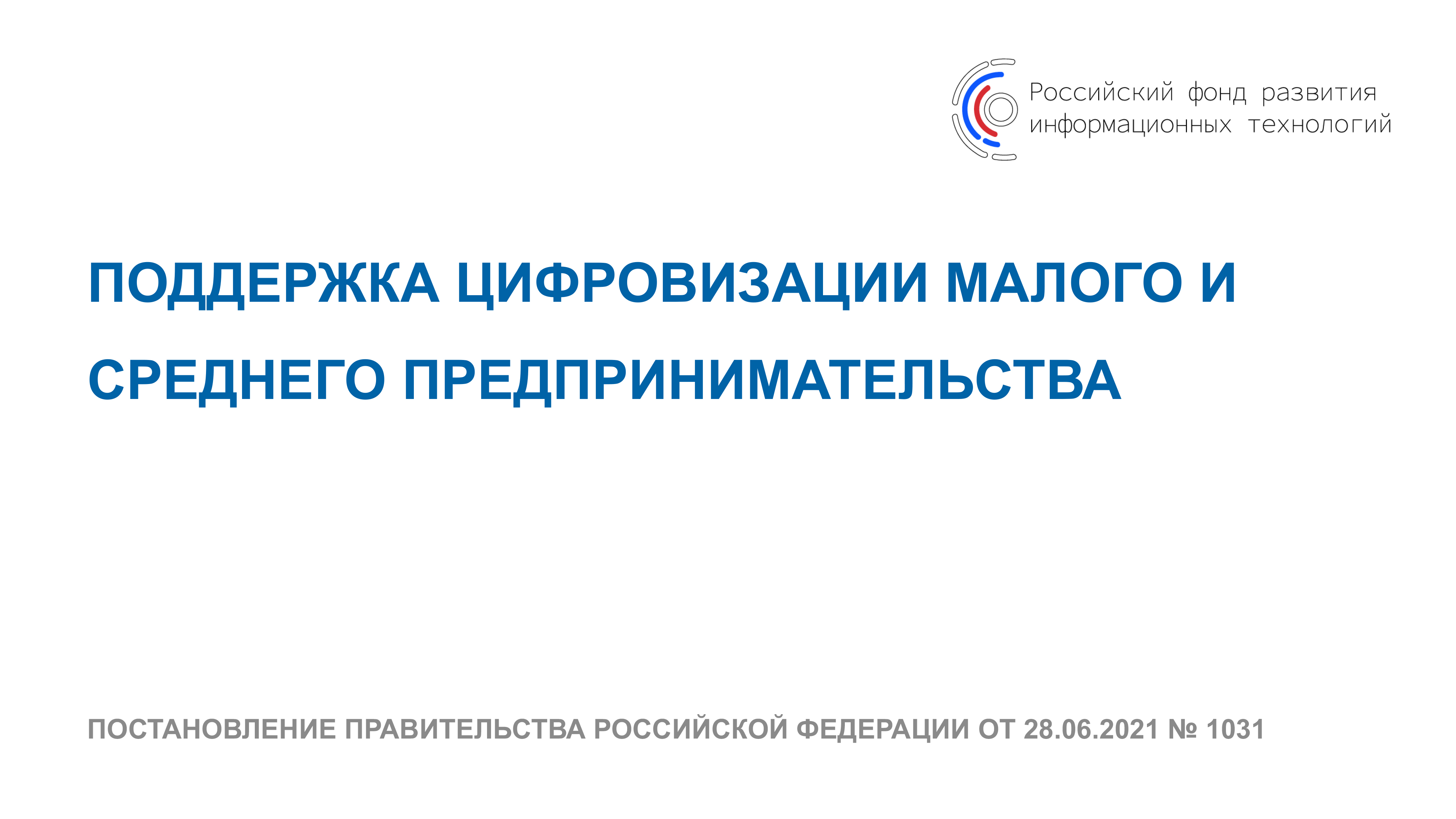 Российским фондом развития информационных технологий (РФРИТ) объявлен конкурсный отбор правообладателей (уполномоченных организаций) в целях возмещения затрат по использованию субъектами малого и среднего предпринимательства российского облачного программного обеспечения. Конкурсный отбор осуществляется в соответствии с постановлением Правительства Российской Федерации от 28 июня 2021 г. № 1031 «Об утверждении Правил предоставления субсидии из федерального бюджета Российскому фонду развития информационных технологий на возмещение затрат по использованию субъектами малого и среднего предпринимательства российского программного обеспечения».