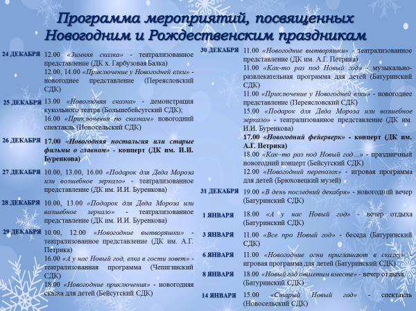 23 декабря 2021 План мероприятий, посвященный Новогодним и Рождественским праздникам, в Брюховецком районе Праздник к нам приходит...