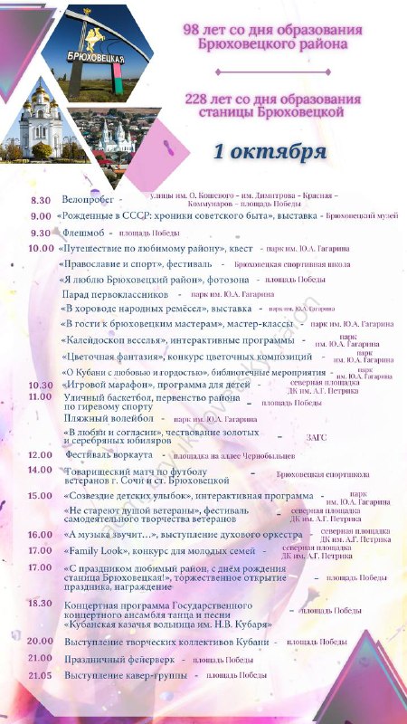 12 сентября 2022 1 октября Брюховецкий район отметит 98 день рождения Программа праздничных мероприятий